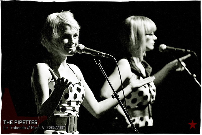 Mouvements synchros, robes à pois assorties et triples sourires en avant, les Pipettes offrent au Trabendo un set majoritairement constitué de nouveaux titres, qui sent bon le nouvel album. Si musicalement, le groupe qui les accompagne atteint vite ses limites, le trio de chanteuses assure, se renvoyant la balle du lead vocal dans des enchaînements parfaits et les ondulations de bras qui vont avec. Le concert est aussi rétro que l’album ― même la salle est en veste et jean slim ―, il ne manque que les micros RCA pour compléter le tableau. Ça danse pour One Night Stand, Why Did You Stay?, Judy et ― avec le doigt en l’air ― Your Kisses Are Wasted On Me, ça tape en chœur des mains sur le Pull Shapes final… We Are The Pipettes clôt [rapidement] la soirée, les lumière se rallument. On est en quelle année, déjà ??
