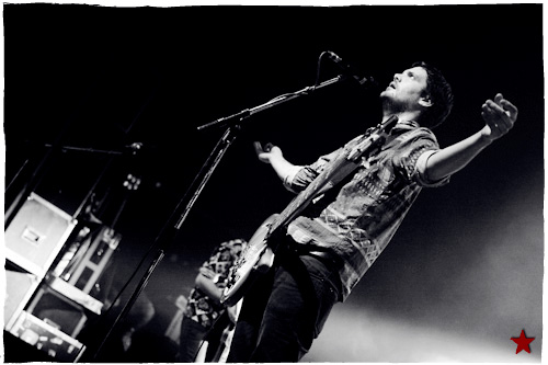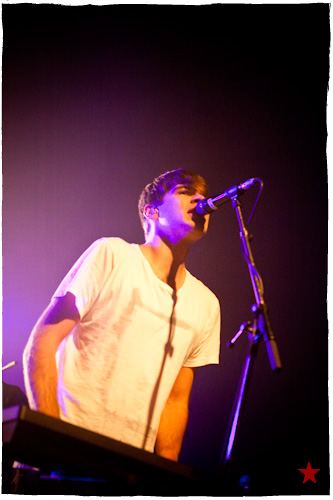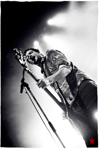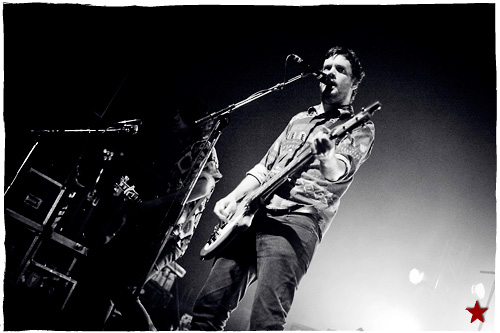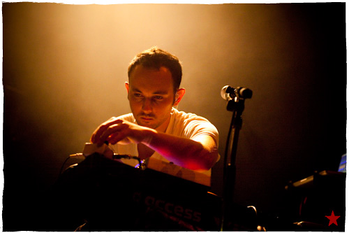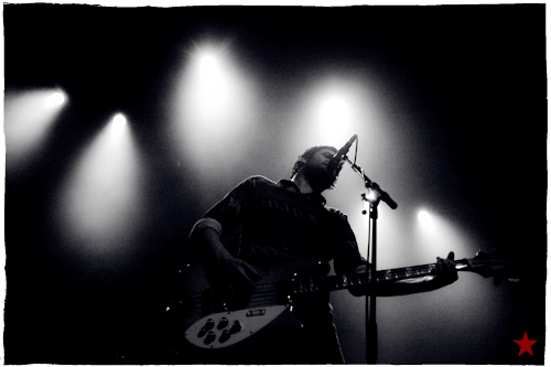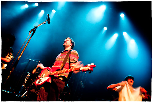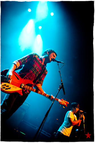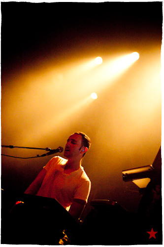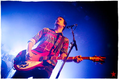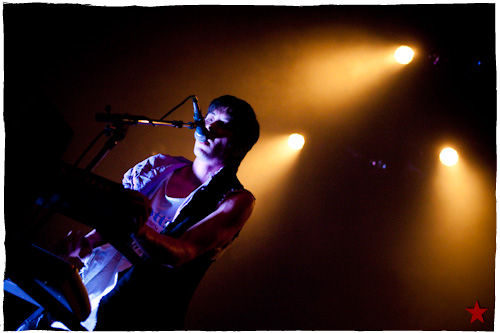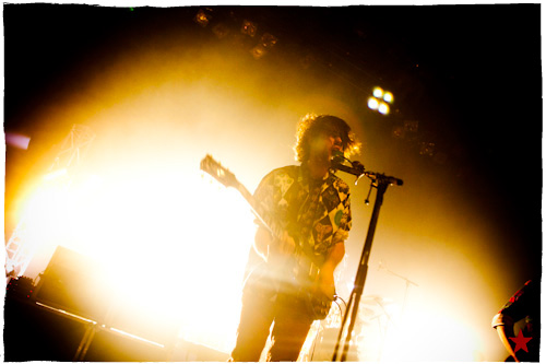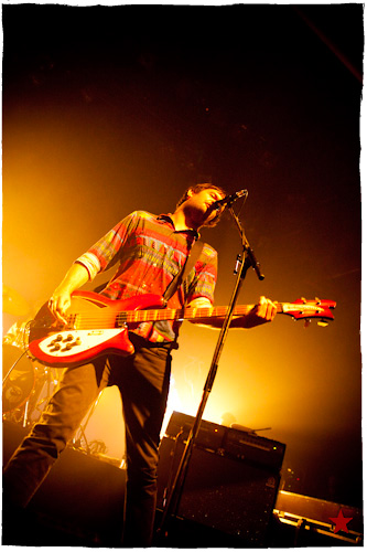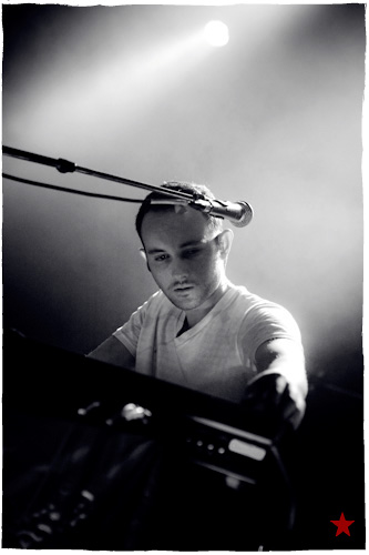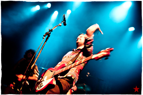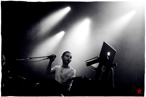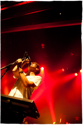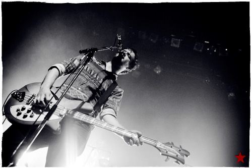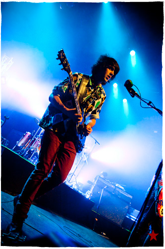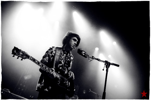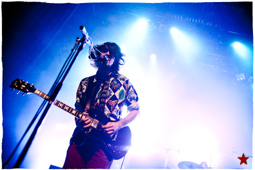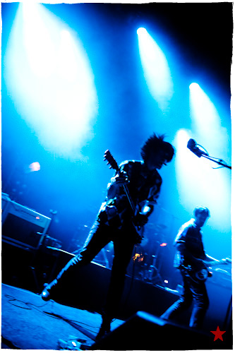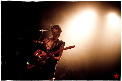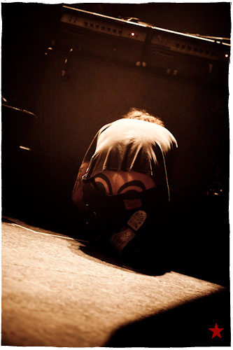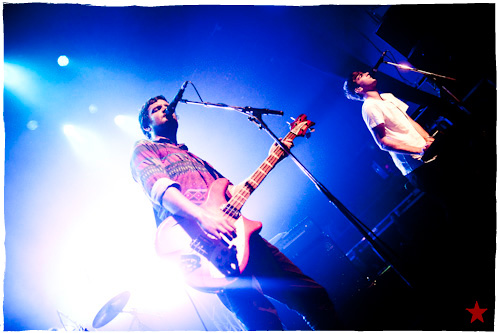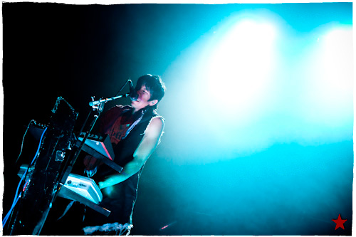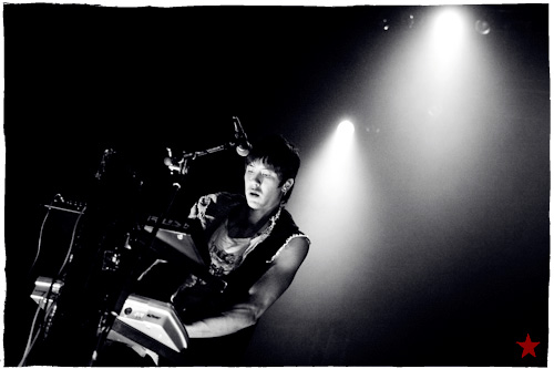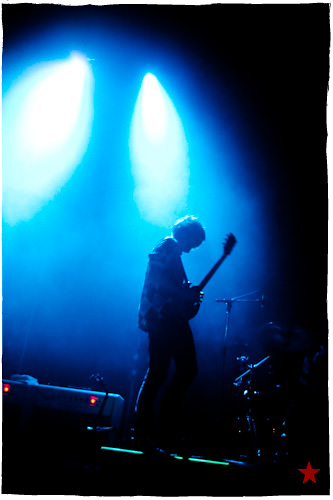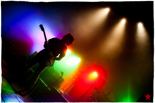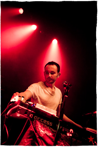 Lucas le Roadie sympa s’est par inadvertance vêtu d’un ticheurte trop court ! Quelques minutes avant l’entrée en scène de Klaxons, se baissant pour cacher un câble de l’ampli de son Simon Taylor-Davis de guitariste préféré au moyen d’un paillasson et de quelques bouts de gaphère savamment disposés, le voilà en train de montrer le plus intime de ses tatouages au premier rang d’une Cigale frémissante d’impatience :