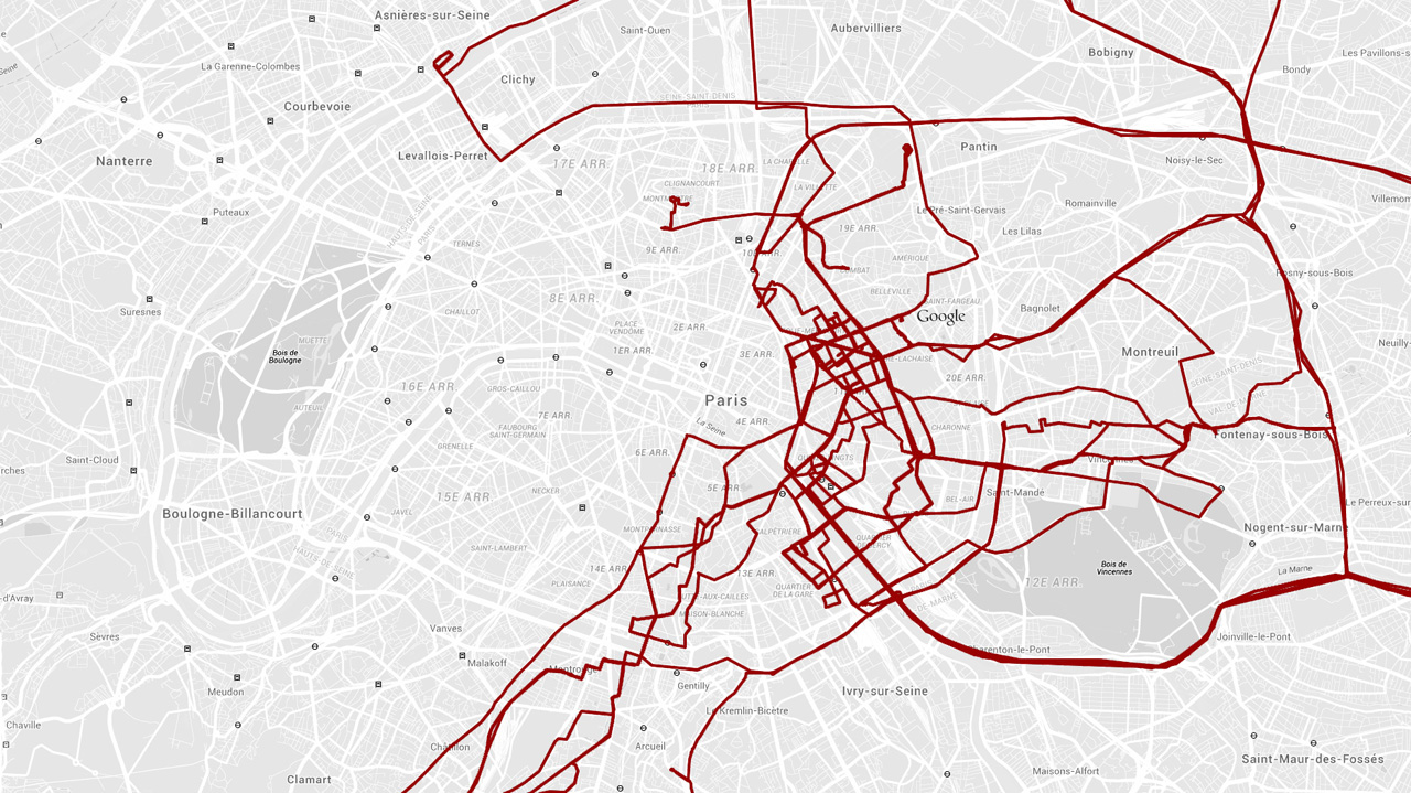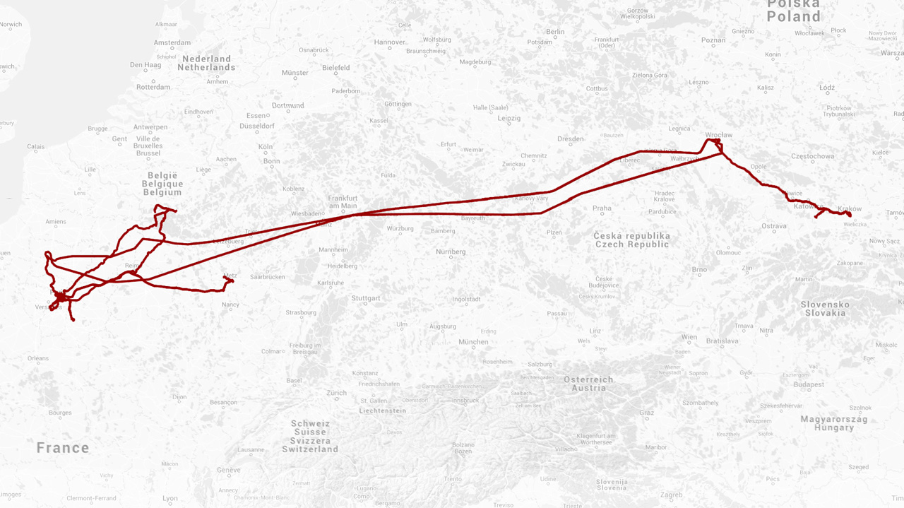 Un anniversaire, un mariage de nouilles, un apéro plein de mains, un concert plein de confettis, un voyage en bus, un musée, une grosse bière, une halle, une chaise, un mur, une visite de nuit, un mémorial, des moines, une porte, un pape, un café au lait, un taxi, un voyage en bus, un gros tunnel, une place du marché, un archipel d’îles la nuit, un portrait d’Adolf Hitler enfant, une grosse chaise, un nain, une sonnette, un dinosaure, un piston, des néons [mais alors plein], un bar, un avion, un gâteau d’anniversaire, un cochon qui fait pouët, un tournage, une exposition, des bières, du champagne, l’épave d’une autre vie, un puits, un Zénith plein, un Zénith vide, des schtroumpfs, une grosse laie, un panneau vierge et 5 026 km de plus au compteur. Mai 2015.