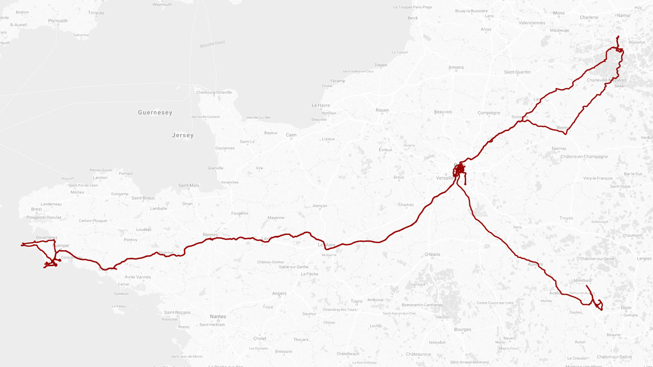 Un bar, un enfant, un Bercy, des coulisses, un chat prénommé Clystère, un concert, un concours de vin, un crépuscule, un bar à cocktail, un anniversaire, un train, un théâtre, un numéro, une pointe, un champ, un phare, un Jésus, une grosse boîte, une pointe, un phare, un graffiti, des voitures bien rangées, une plage, un concert, une Saint-Disquaire, une flamiche, une chorale, un concert, un concert, une butte, un bar, une soirée, une Panhard CD et 2 853 km de plus au compteur. Avril 2017.