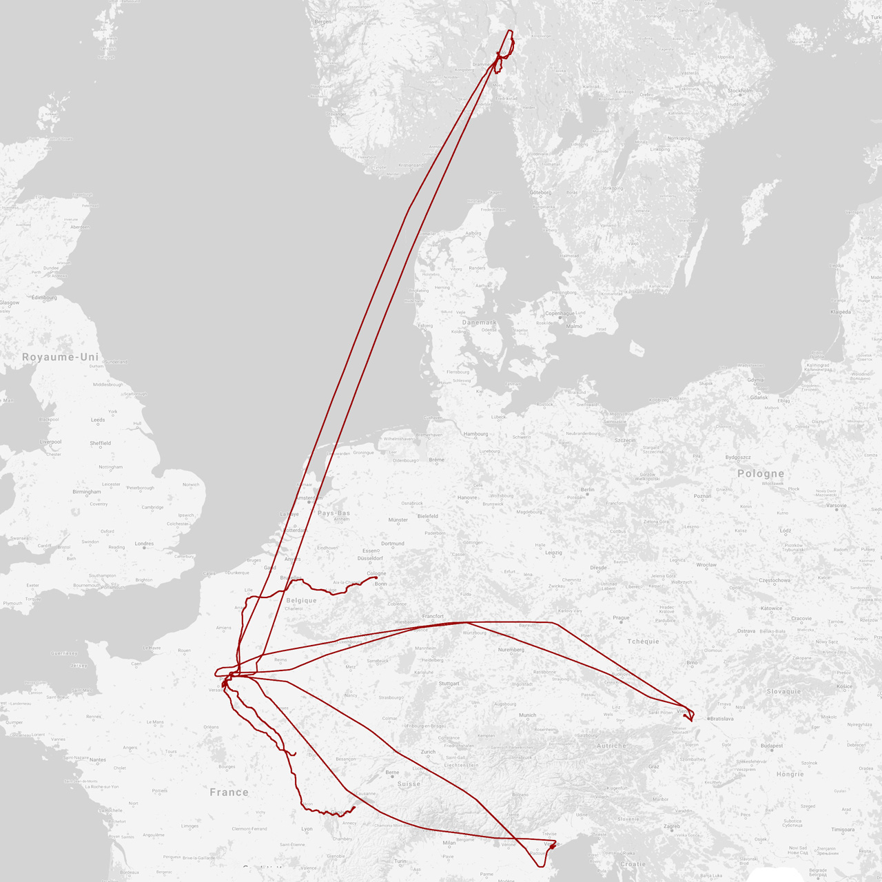 Un vernissage, un avion, un bar, un gros paon, un opéra, un sauna, un bateau, la même statue que ce soir-là, un bateau, un bar, une chapelle, une voiture, un beau cygne, une bière, une toilette, un hôtel de ville, deux beaux cygnes, une ancre, des cabanes, un bateau, un bateau, des plaques, un cimetière, un fjord, des maisons, un cimetière, une ruelle, un kransekake, une élection, un ponton, un panoramique, un port, une terrasse, des chaises, une salle, des portraits, des ferronneries, une ombre, un gros gros monolithe, une pizza, un avion, une photo, un bar, une toilette, un train, une gare, un pont, une cathédrale, une gare, un pont, une statue, une grosse saucisse, un babyfoot, une statue, un panoramique, un pont, un piano, un automate, une voiture volante, des Slovaques, des portraits, un train, un verre, un concert, un quart de finale, un anniversaire, un avion, un café, un scotère, un métro, un campus, un panoramique, un gros cerf, une porte, une tour de défense, un escalier, un numéro, un avion, un chanteur démaquillé, un chat prénommé Pierre-Louis-Brice, un bagagiste, un chien, une valise qu’heureusement que c’est pas la tienne, un avion, un bateau, un canal, un toit, un escalier, une cour, un plafond, des statues, des chaises, une fenêtre qui gondole, une gondole qui fenêtre, une fenêtre sans gondole, une statue, une gondole, un vaporetto, un chœur, un bateau, une ménagère bien assortie, une corde à linge, un numéro, un vaporetto, un canal, une gare, un canal, un panoramique, une lune, une ruelle, un canal, un pont, une ruelle, une ruelle, une ruelle, une place, un pont, un bateau, une vitrine, une belle vue, un plafond, une nef, une photo, un avion, une paire de fesses et 10 338 km de plus au compteur. Mai 2017.