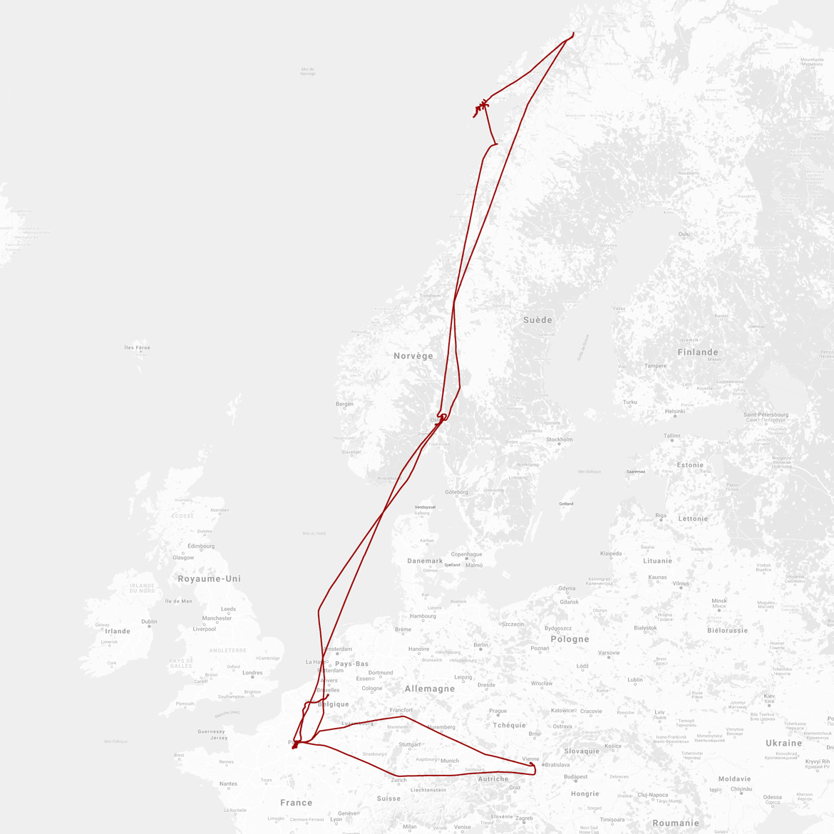 Un avion, un gros tancarville, un sauna, un coucher de soleil, un avion, un lever de soleil, un dessin, un avion, une voiture, un arbre, un chalet, une église, un déjeuner, un village, une boîte à lettres, un lac, un port, un rorbu, un vélo, une mouette, un coucher de soleil, un village, une route, une plage, un troupeau de photographes, une plage, une pêcherie, une porte, un bus, une lampe, un village, un bateau, une épicerie, un café, une tombe, un village, un bateau, un paquet de photographes, une aurore boréale, un rorbu, une plage, une photo-bombe, un bateau, un rorbu, un coucher de soleil, une lampe, un crépuscule, une pêcherie, un bateau, une église, un café, un avion, un avion, une pièce de théâtre, un métro, un bar, un grafitti, un escalier, une tour, un acrobate, un toit, un restaurant, une partie de jeu vidéo, une rue, un RER, un avion, un apéro, un tram, un banc, une ombre, un immeuble, un carrelage, une nef, une station de métro, un café, un opéra, un café, un tram, un canal, un coucher de soleil, un avion, une bière, un billard, un avion, un chat prénommé Transhumance, un bar de Thalys, un enterrement de vie de garçon, un graffiti, un bar, une boîte et 9 616 km de plus au compteur. Mars 2019.