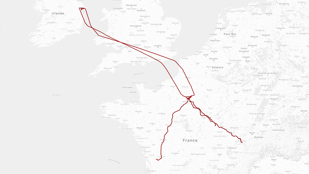 Un train, un resto, un spectacle, une passerelle, un spectacle, une boîte, un bar, un nuage, un lac, un train, un coucher de soleil, une lecture, un buste, un clocher, un apéro, un RER, un aéroport, un avion, un aéroport, un hurling, un handball gaélique, un pub, un mur, un miroir, un pub, un pub, une distance sociale, un train, un avion, un train, un salon, un concert, un concert, un dessin, un concert, un tabouret, une instagrameuse, un coucher de soleil, une tour, un RER, un téléphone, une affiche, un bureau, une cour d’honneur, des fiançailles, un coucher de soleil, un bisou, une passerelle, une flaque, un apéro sauvage, un métro, un métro, une cour, un bisou, un anniversaire, une peinture, un bisou, une poupée, un chat prénommé Cagnotte, une bière, une sieste, un avion, une piste, un avion, un schlouck, une tour, une loooooongue promenade, une chèvre, un poteau, une rue et 4 991 km de plus au compteur. Octobre 2021.