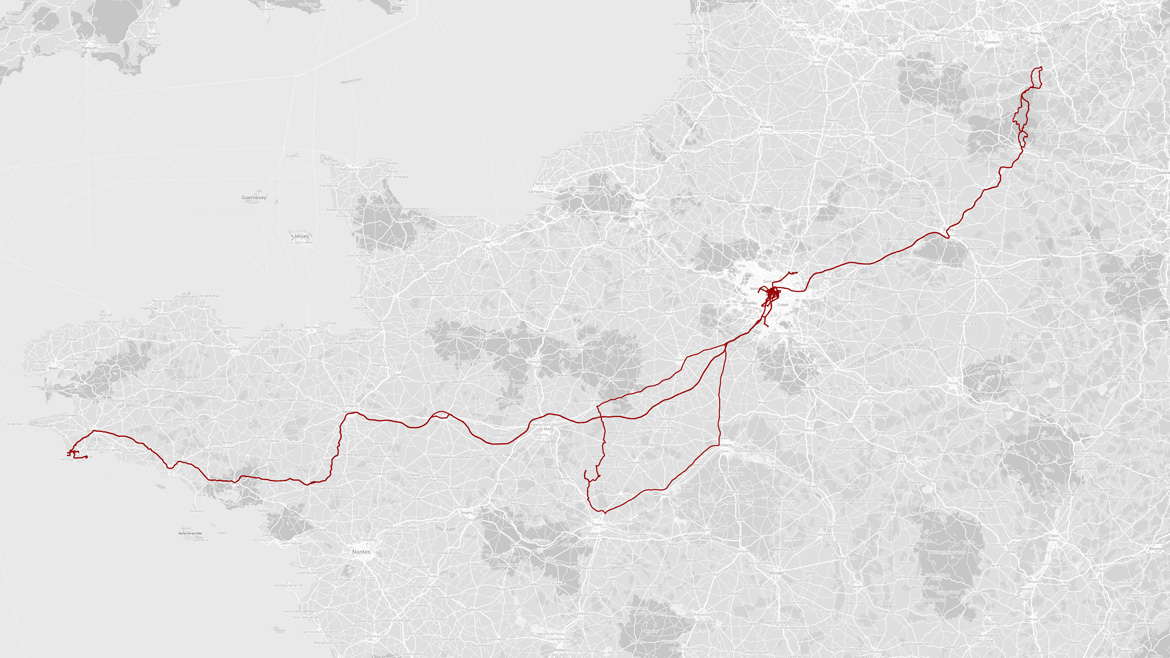 Un avion, Un apéro, une ruelle, une gare, des paons, un chat prénommé Bruschetta, un train, une ardoise, une nuit venteuse, une terrasse, une plage, un blockhaus, une plage, un coucher de soleil, une tempête, un restaurant, une partie de fléchettes, un rayon de soleil, un bus, un vernissage, un hôpital, une gare, une commémoration, un brouillard, une gare, un train, une clope, un concert, une pyramide, une photo, un bateau, un institut, une île, un tigre, une vitrine, une nuit dehors, un bac à champagne, un anniversaire, un lapin prénommé civet, un arrêt de bus, un concert, un cousin, un pont, un musée, un quai, un coucher de soleil, un pont, un train, un chantier, un cartable, un chapeau, un miroir, une voiture, une pause, une maison, un restaurant, une cour et 3 354 km de plus au compteur. Novembre 2022.
