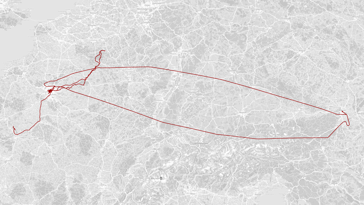 Un chat prénommé Paupiette, un coucher de soleil, un âne prénommé Ramette, un apéro, une lampe, des ombres, un immeuble, une clope, un métro, un mur, un chat prénommé Ça-va-l’Chalet, un quai de gare, un escalier de gare, un quai de gare, un resto, un chat prénommé Paupiette, un bar, un quouize, un opéra, un échafaudage, une affiche, un reste de pluie, un coucher de soleil, un aréoport, une goutte, un avion, une demande, un mur, une aile, un aréoport, un café, un miroir, une gare, une cour, des colonnes, un arbre, un rayon de soleil, une poubelle, une chimay, un graffiti, un déménagement, une tonne de dišques, une tour, un quai, un bus, une vitrine, un siège, un couloir, une pub, une pub, une banque, un heurtoir, une paire de valises, un café, un métro, un anniversaire, un déménagement, une clope et 4 121&bsp;km de plus au compteur. Avril 2023.