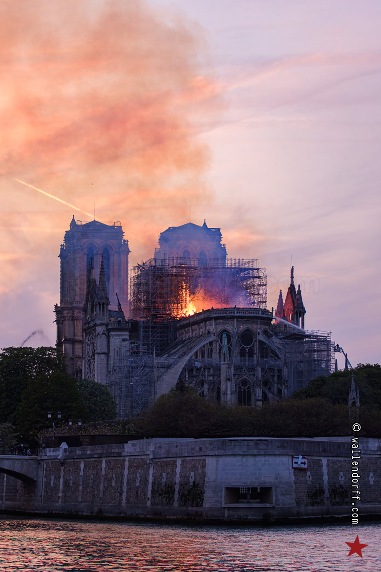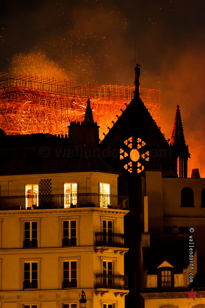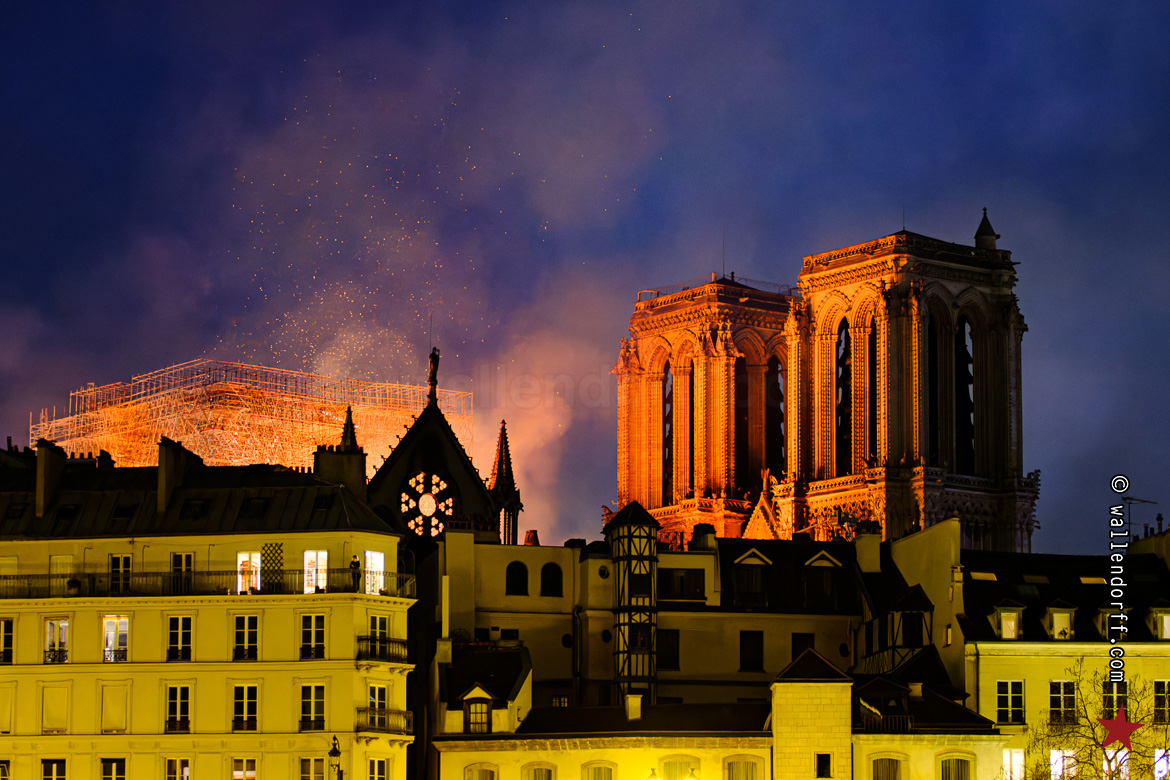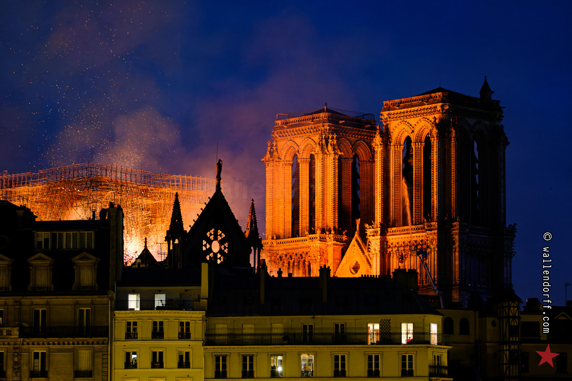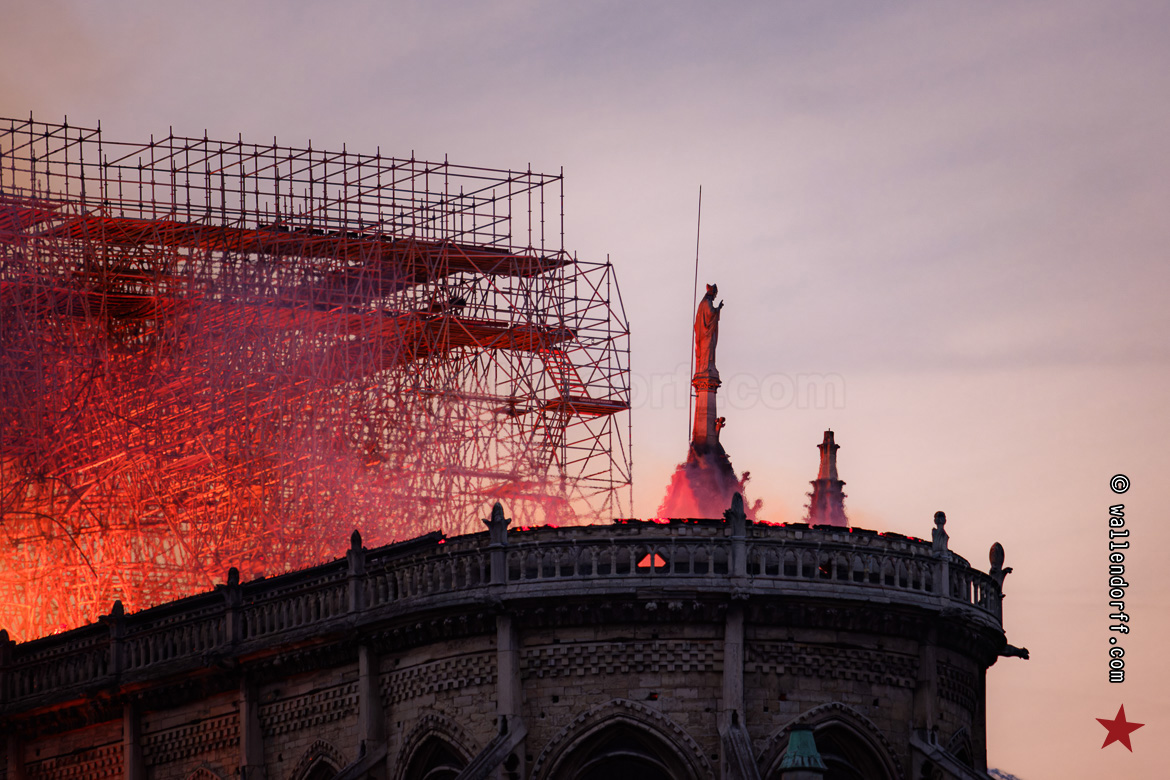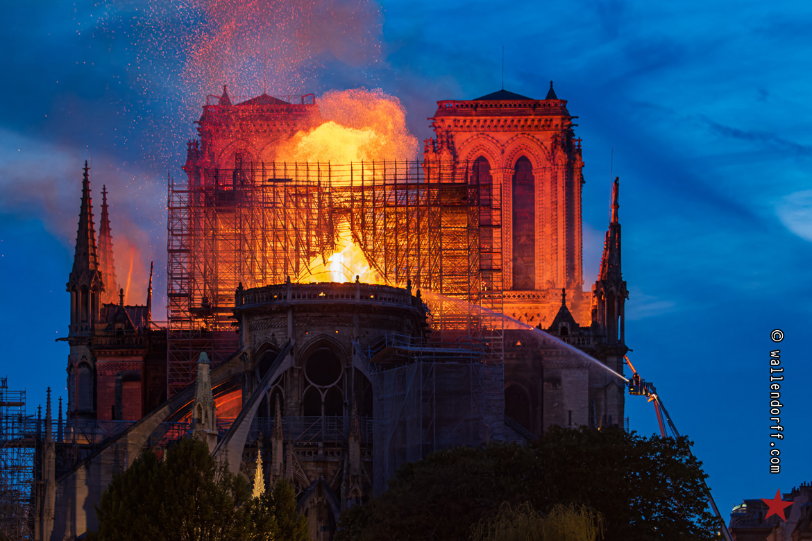 En me frayant un passage à travers la foule silencieuse, massée à la frontière du bouclage de la police, je découvre le trou béant. La flèche s’est écroulée pendant mon trajet. Ne reste qu’un brasier gigantesque dans le crépuscule, contre lequel lutte une minuscule lance à incendie.