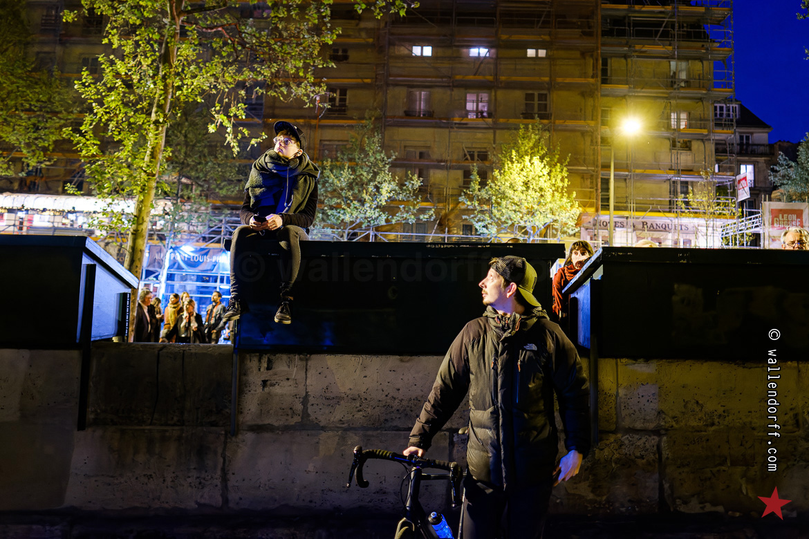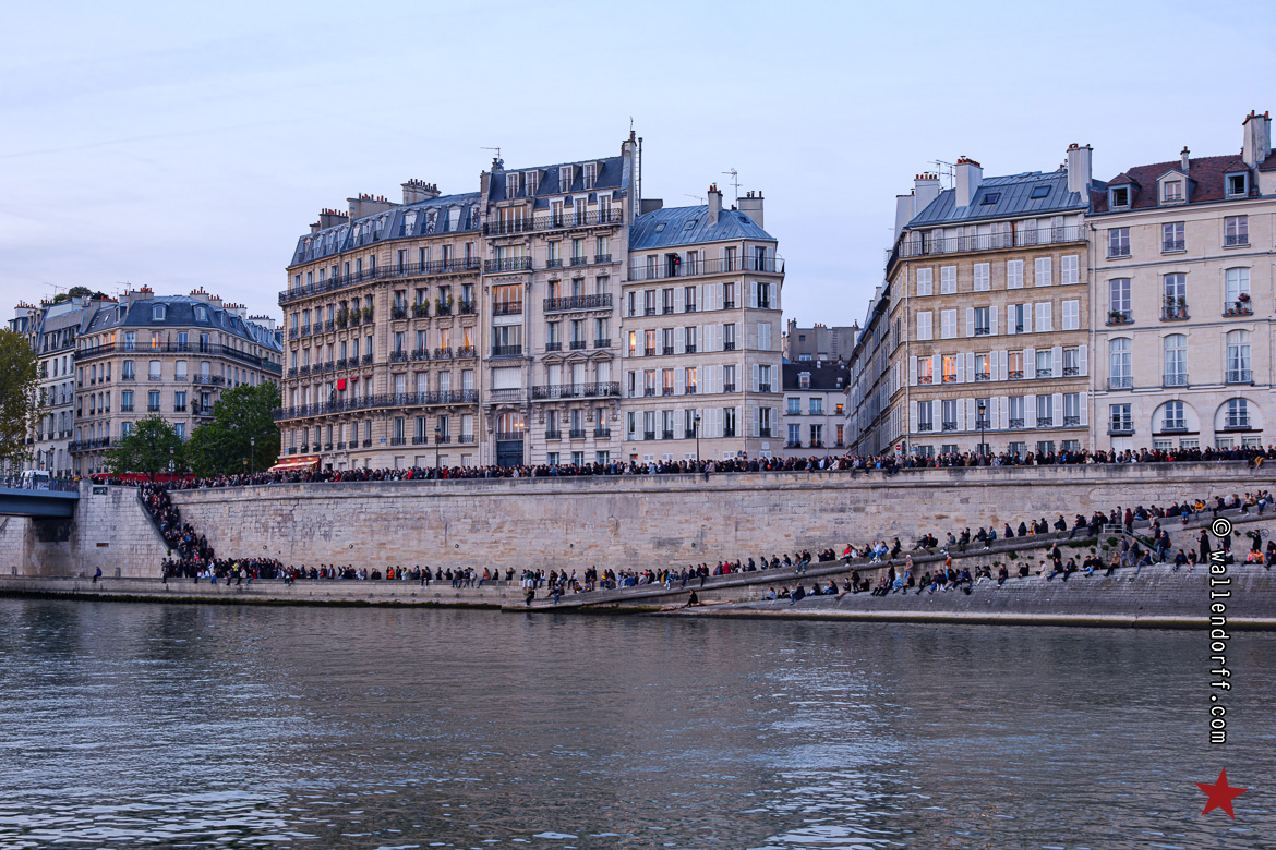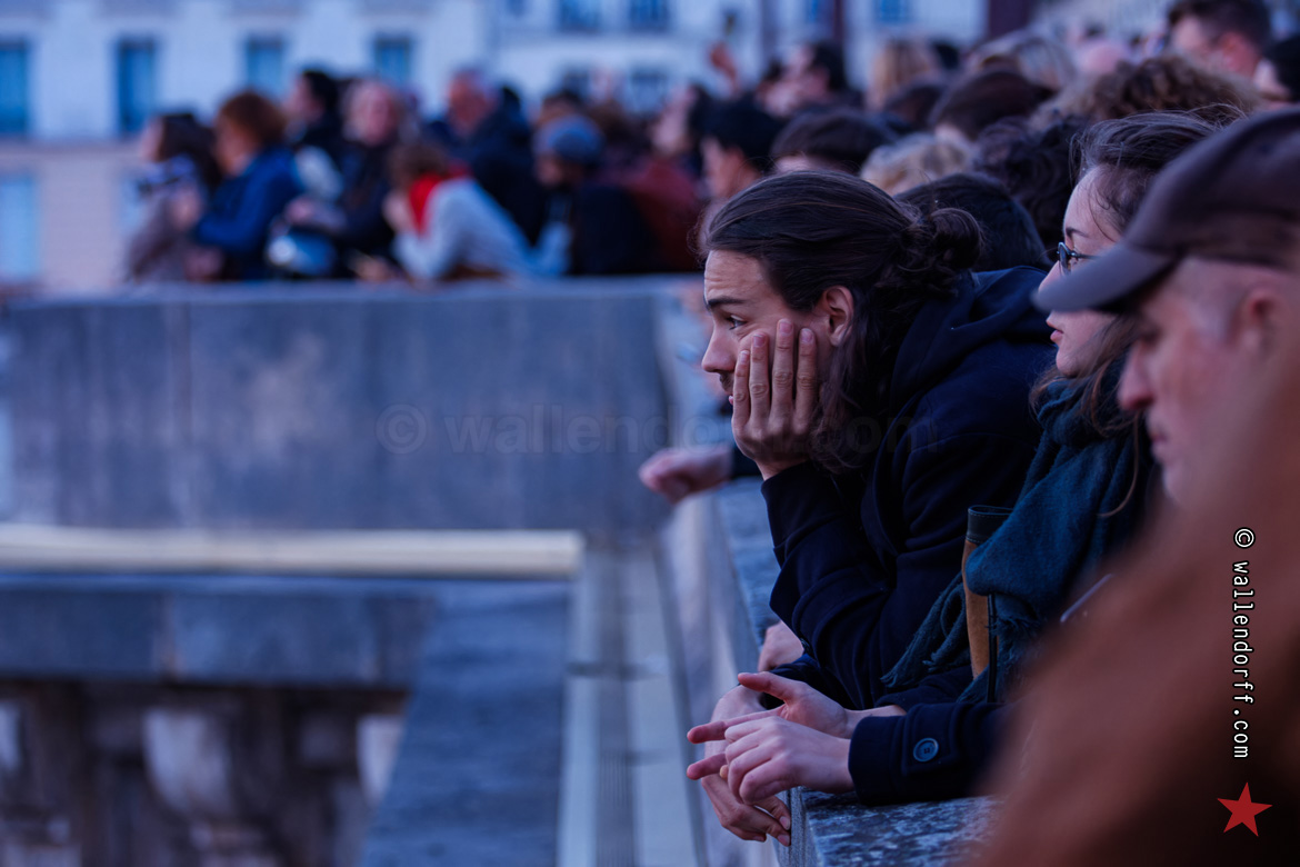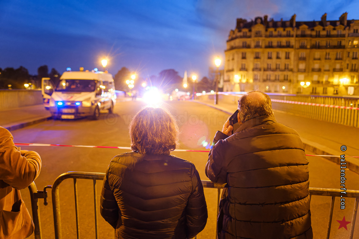 Tout se joue dans un silence de mort. Les quais sont noirs de monde. Des gens aux fenêtres. Des gens sur les trottoirs. Des gens sur le pont de la Tournelle, en plusieurs couches. Une foule aux aguets, encore marquée par la chute de la flèche. Une foule qui murmure et qui ne comprend toujours pas comment des choses pareilles peuvent arriver… et qui se demande si ça va s’arrêter là.
